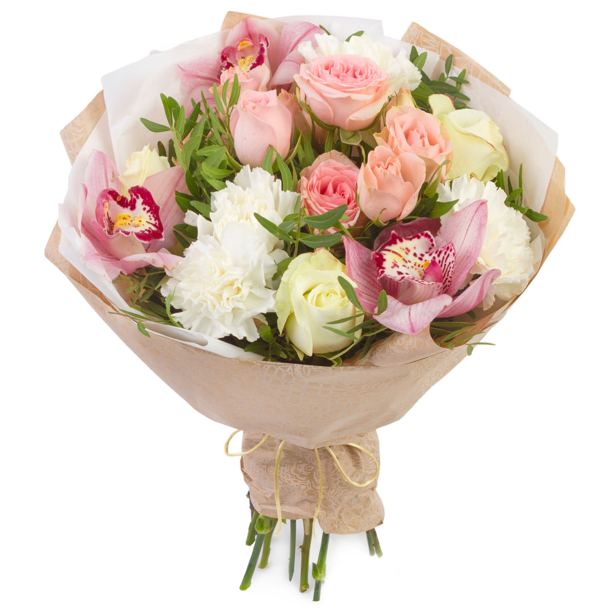 Роза одноголовая розовая и чайная, орхидея розовая, гвоздика белая, фисташка. Упаковка (лента, пленка, крафт, сетка, пленка матовая)