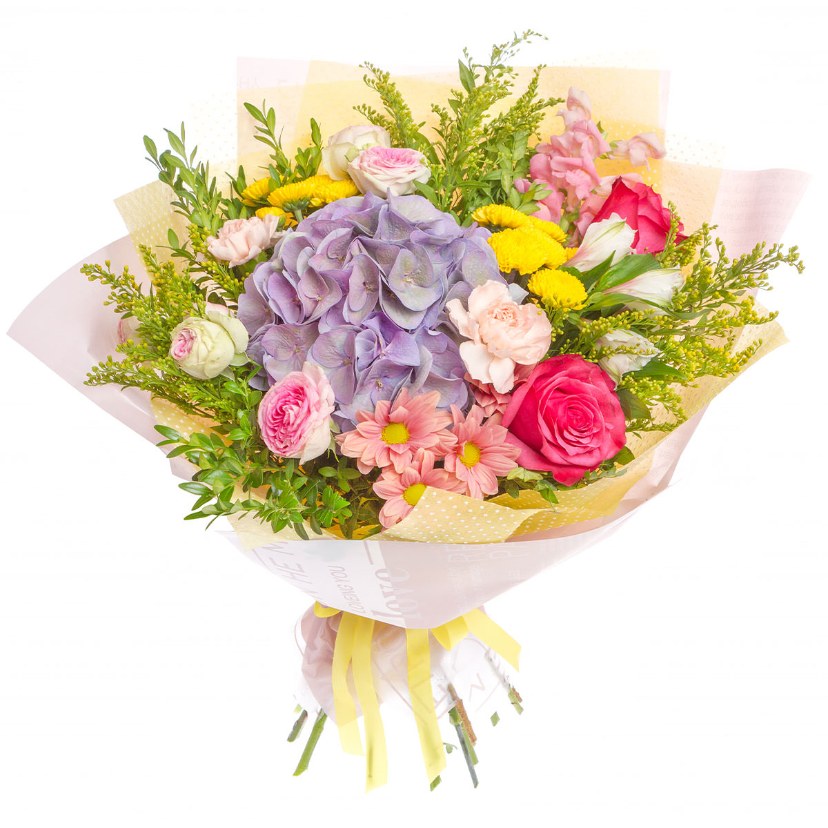 Гортензия фиолетовая, роза одноголовая розовая, хризантема кустовая желтая, роза пионовидная кустовая, солидаго, альстромерия, львиный зев. Упаковка (лента, пленка, крафт, сетка, пленка матовая)