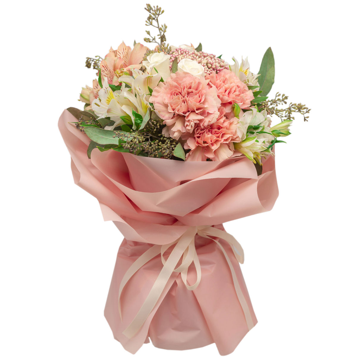 Роза одноголовая белая, альстромерия белая и розовая, диантус (гвоздика) розовый, трахелиум, эвкалипт. Упаковка (лента, пленка, крафт, сетка, пленка матовая)