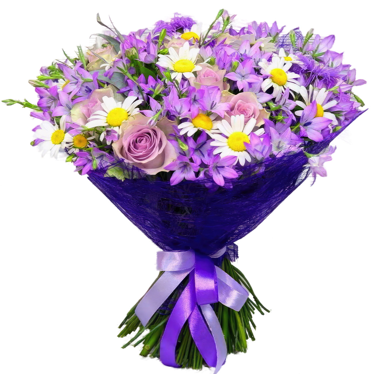 Колокольчик, роза одноголовая сиреневая, ромашка. Упаковка (лента, пленка, крафт, сетка, пленка матовая)