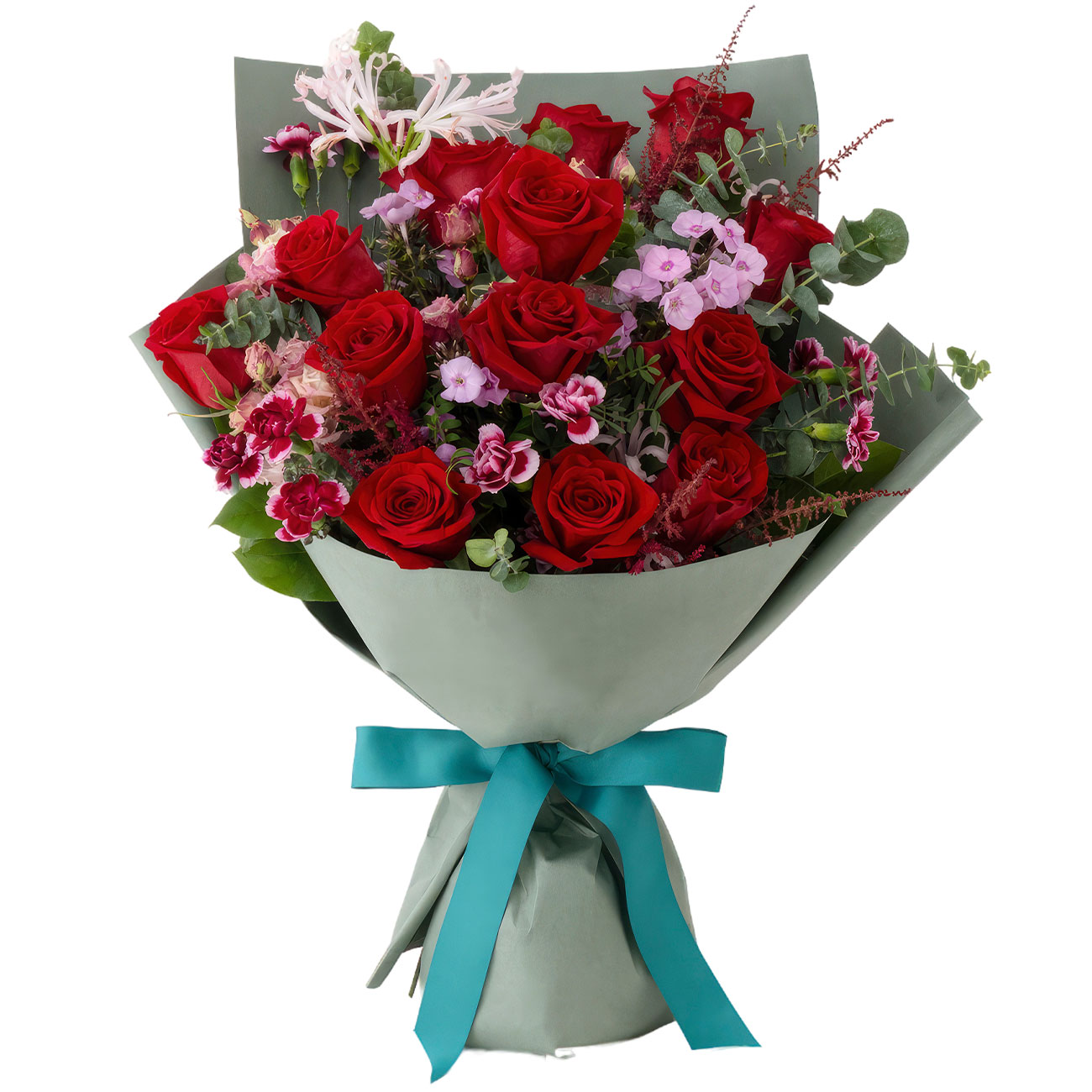 Роза одноголовая красная сорта Аваланж, нерина розовая голландская, гвоздика кустовая мини голландская, эвкалипт. Упаковка (лента, пленка, крафт, сетка, пленка матовая)