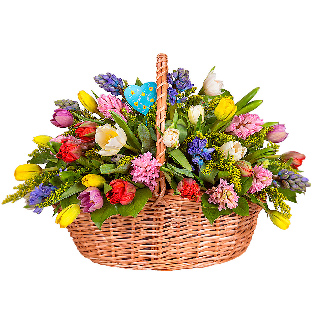 Тюльпаны микс (желтый, красный, сиреневый, белый), гиацинт, солидаго. Упаковка (Корзина, оазис).