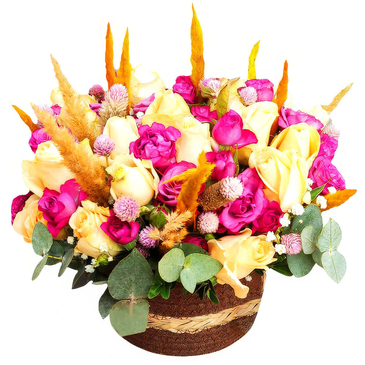Роза одноголовая кремовая и розовая, сухоцвет, гипсофила, эвкалипт. Упаковка (Корзина, оазис, ящик).