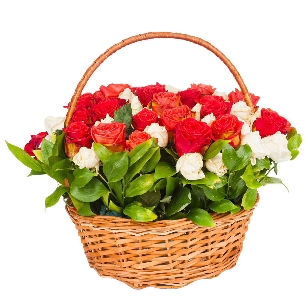 Роза одноголовая красная, роза кустовая белая. Упаковка (Корзина, оазис, ящик).