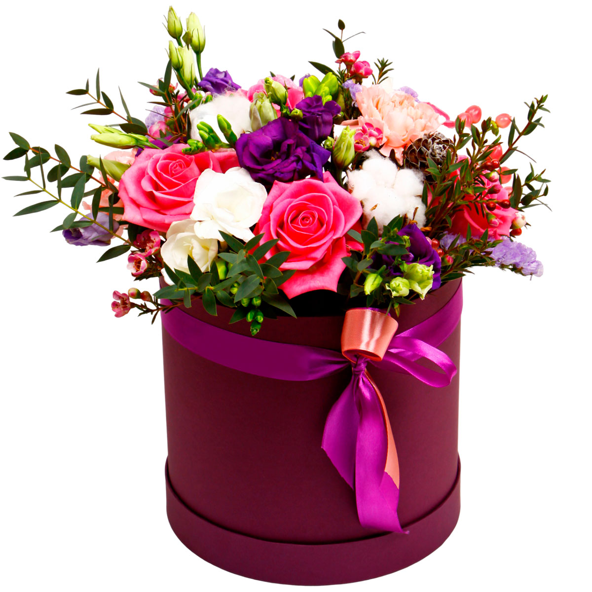 Роза одноголовая розовая, эустома фиолетовая, фрезия белая, ваксфлауэр розовый, хлопок, гиперикум, статица сиреневая, зелень. Упаковка (шляпная коробка, квадратный бокс, коробка сердце, оазис)