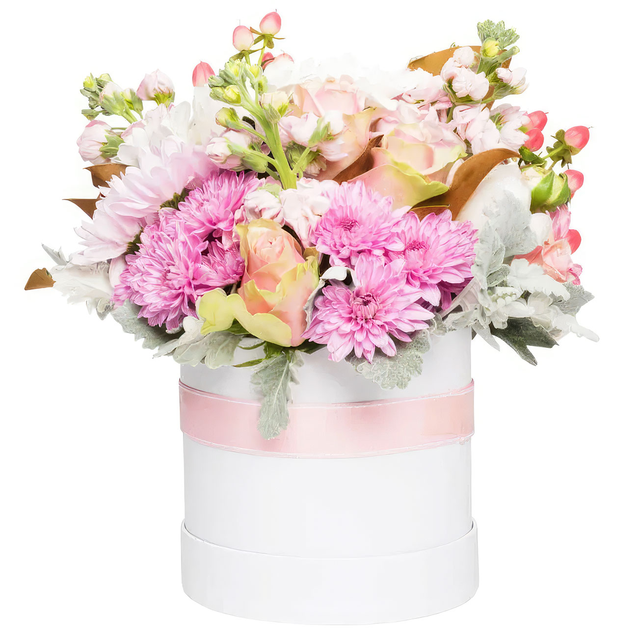 Роза одноголовая розовая, хризантема кустовая розовая, маттиола розовая, гиперикум, зелень. Упаковка (шляпная коробка, квадратный бокс, коробка сердце, оазис)