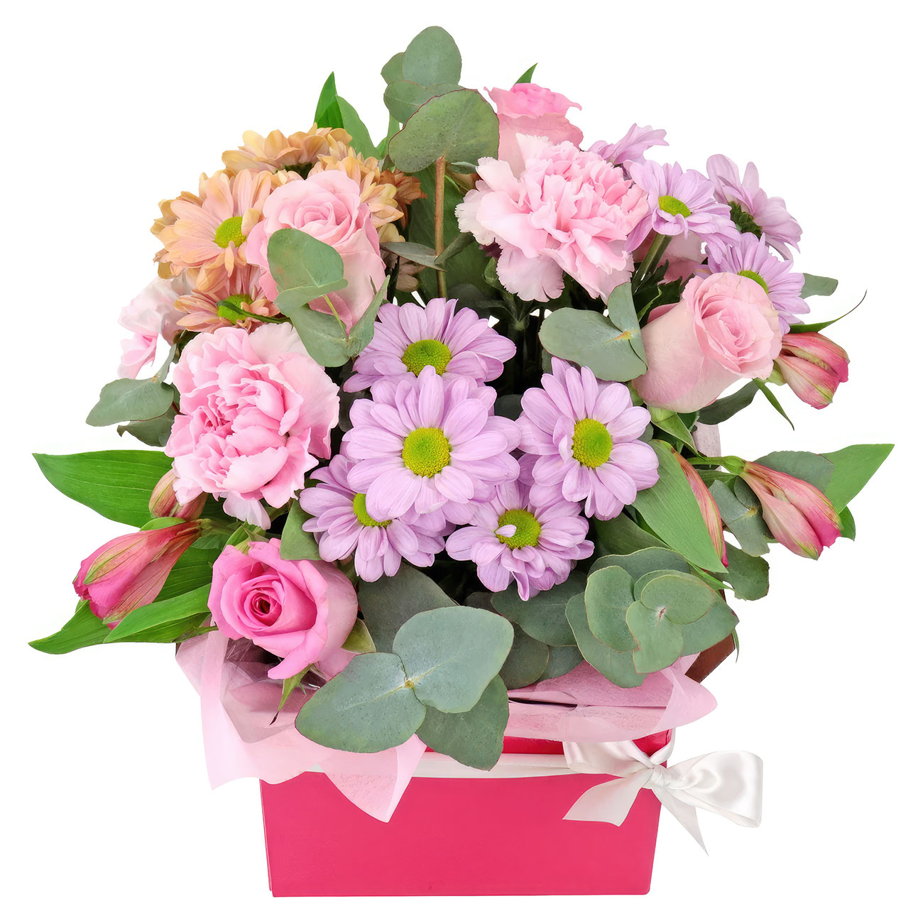 Роза одноголовая розовая, хризантема кустовая сиреневая и кремовая, альстромерия розовая, гвоздика розовая, эвкалипт. Упаковка (шляпная коробка, квадратный бокс, коробка сердце, оазис)