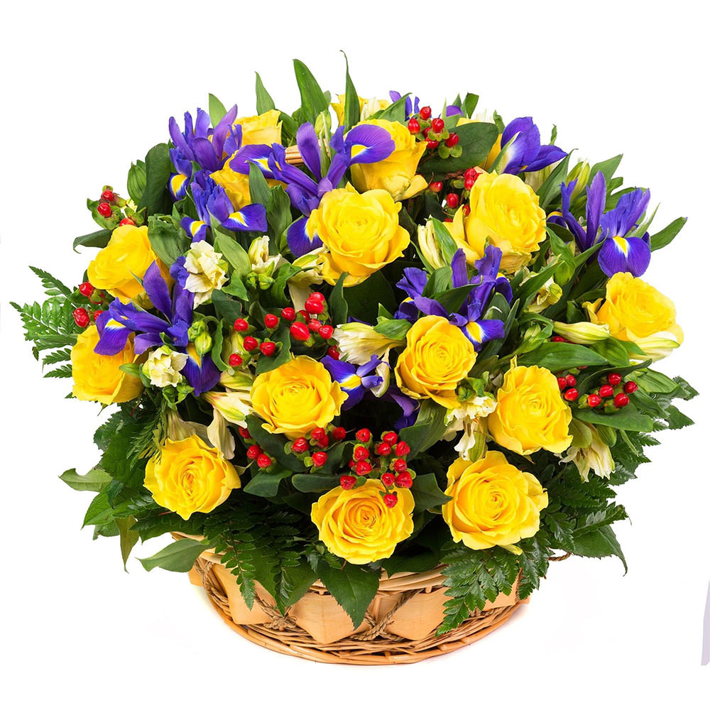 Роза одноголовая желтая, ирис, альстромерия желтая, гиперикум, зелень. Упаковка (Корзина, оазис).